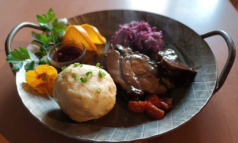 Auf der Speisekarte haben Sie u. a. die Wahl zwischen Hirschgulasch mit Semmelknödeln, Wild-Steak mit Pilzrahmsoße, Wildschweinschnitzel im Rotweinsaft und Lammbraten mit Speckbohnen.