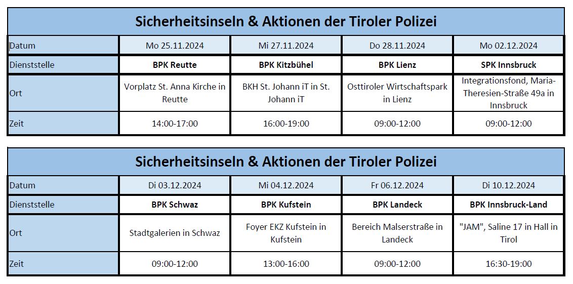 Um Betroffenen und deren Unterstützern eine niederschwellige Möglichkeit zu bieten Hilfe und Beratung in Anspruch zu nehmen, werden im Aktionszeitraum von 25. November 2024 bis 10. Dezember 2024 in allen Tiroler Bezirken sogenannte „Sicherheitsinseln“ eingerichtet (Termine siehe Anhang).