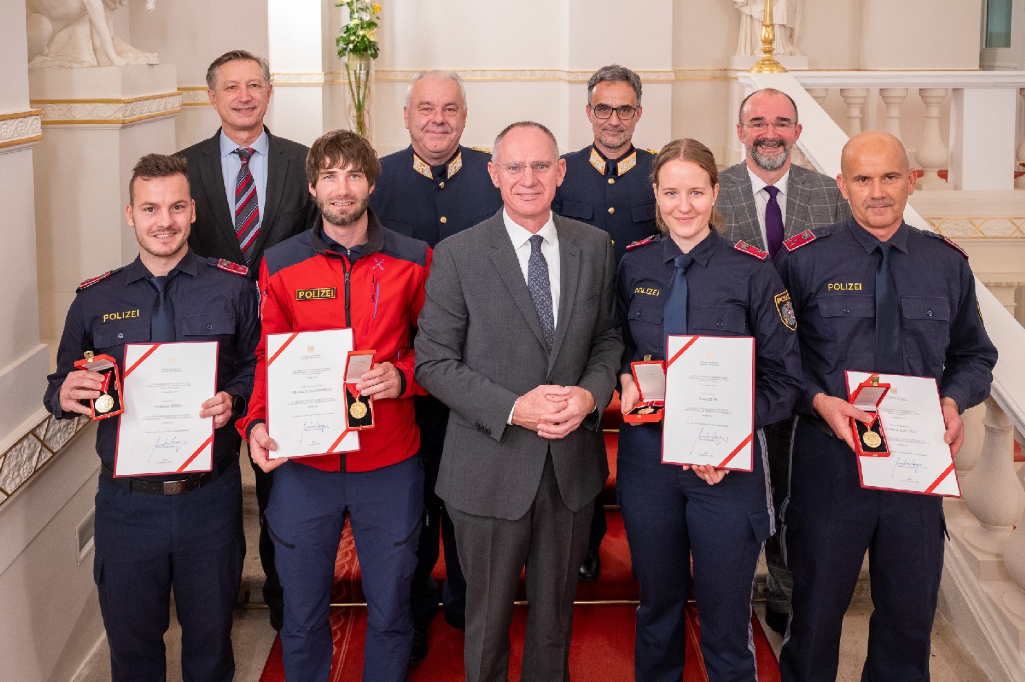 Am 28. November 2024 ehrte Innenminister Mag. Gerhard Karner im Festsaal des Innenministeriums in Wien insgesamt zwölf Polizistinnen und Polizisten, die im Dienst und in ihrer Freizeit zu Lebensretterinnen und Lebensrettern wurden, davon drei Polizisten und eine Polizistin aus Tirol. Im Beisein der BMI- Führungskräfte Sektionsleiter I Mag. Karl Hutter MBA, Sektionsleiter III Dr. Mathias Vogl, Leiter der DSE MinRat Bernhard Treibenreif MA sowie des stellvertretenden Landespolizeidirektors für Tirol, Mag. Johannes Freiseisen MA, übergab der Innenminister die „Goldene Medaille am roten Bande für Verdienste um die Republik Österreich“ anlässlich einer Lebensrettung an Abteilungsinspektor Mathias Außerdorfer des Bezirkspolizeikommandos Lienz sowie an Gruppeninspektor Reinhard Hintner, Inspektorin Nicole Peer und Inspektor Alexander Stock der Polizeiinspektion Kufstein.
