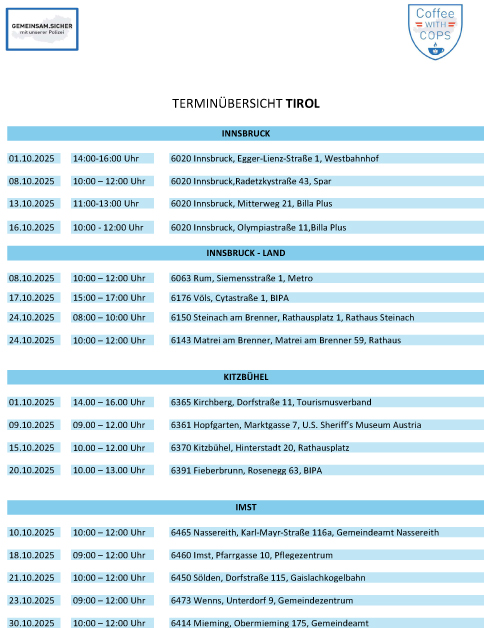 Im Rahmen der Initiative „GEMEINSAM.SICHER mit unserer Polizei“ findet im Oktober 2025 ein „Coffee with Cops“ –Aktionsmonat in ganz Tirol statt. Die Initiative bietet den Bürger:innen die Gelegenheit sich bei einer ungezwungen Tasse Kaffee mit den Polizist:innen vor Ort über sicherheitsbezogene Themen auszutauschen, Fragen zu stellen und allgemeine Anliegen zu besprechen.