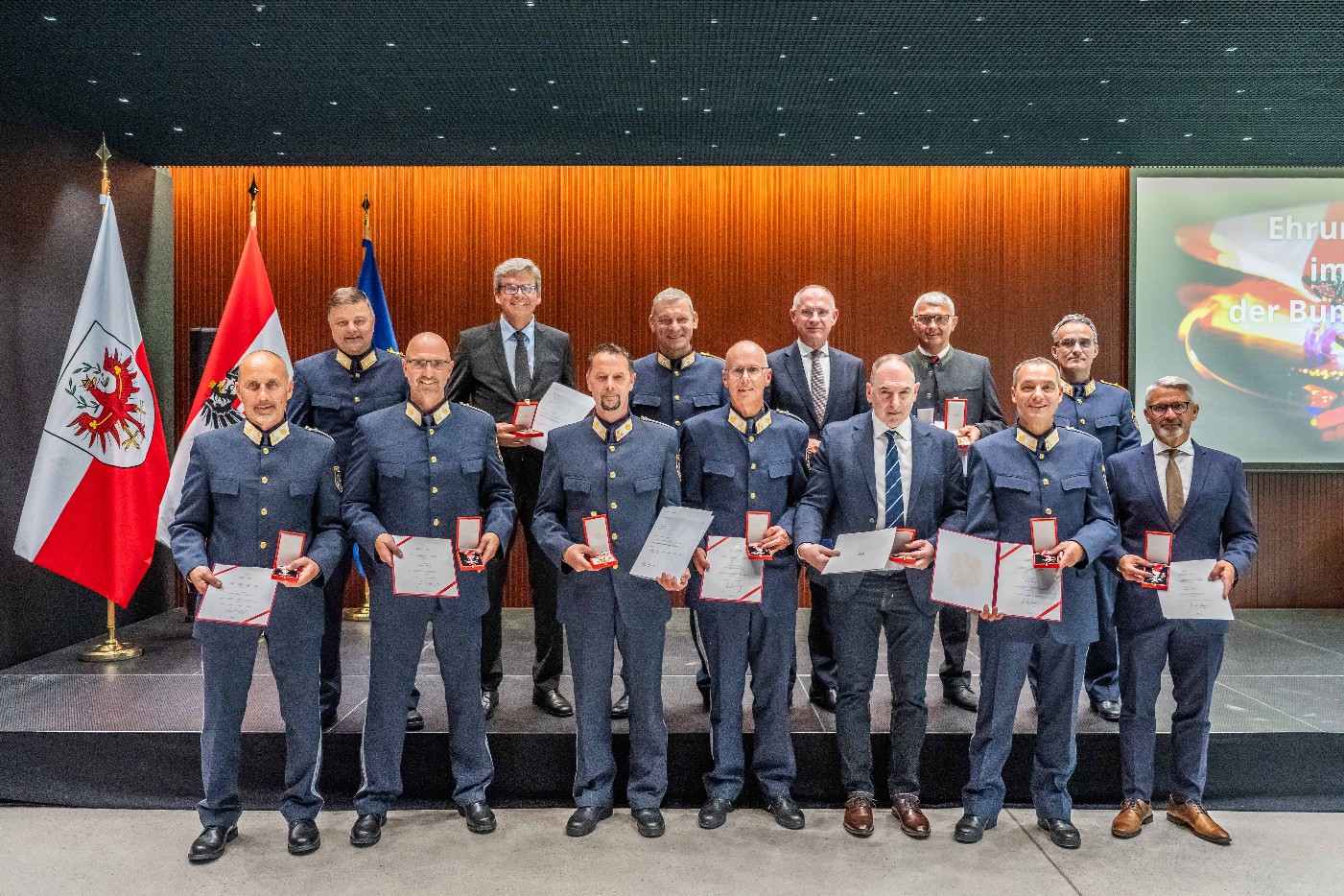 Am 7. Oktober 2025 fand im „Saal der Bundespolizei“ im neuen Sicherheitszentrum der Landespolizeidirektion Tirol in Innsbruck die feierliche Ausfolgung von neun Bundesauszeichnungen durch Innenminister Mag. Gerhard KARNER und Landespolizeidirektor HR Mag. Helmut TOMAC statt. An der Veranstaltung nahmen neben den beiden stv. Landespolizeidirektoren GenMjr Johannes STROBL BA und HR Mag. Johannes FREISEISEN MA, auch einige Behördenvertreter und Repräsentanten der Polizei und der Personalvertretung teil. Für die würdevolle musikalische Umrahmung des Festaktes sorgte ein Quintett der Polizeimusik Tirol.