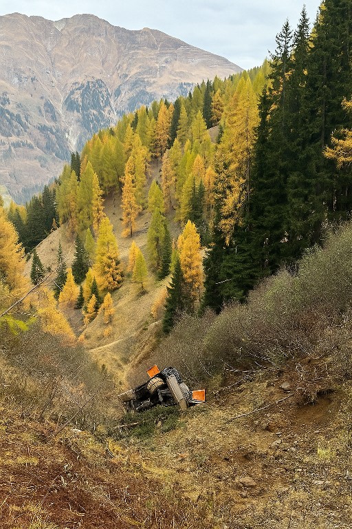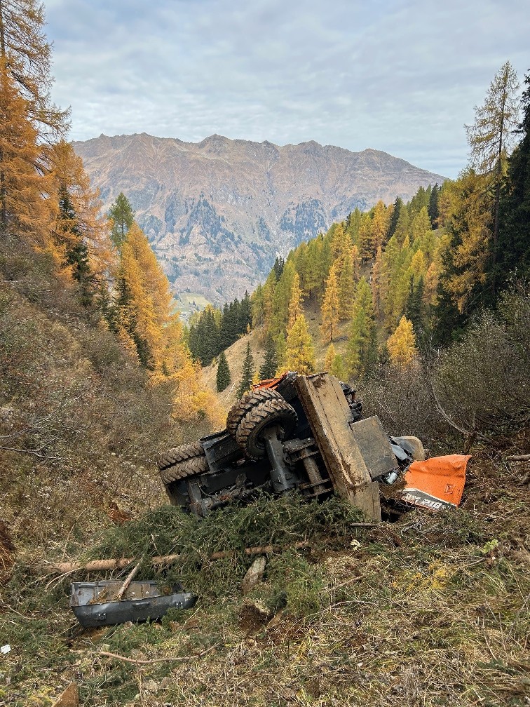 Am Vormittag des 20.10.2025 war ein 22-jähriger österreichischer Staatsbürger mit einem Radbagger im Gemeindegebiet von Hopfgarten in Defereggen mit Aufräumarbeiten von Schadholz beschäftigt. Gegen 10:00 Uhr befuhr der Mann einen Forstweg in Richtung Bloshütte. Beim Rückwärtsfahren brach der Weg seitlich ab, wodurch der Radbagger etwa 100 Meter, sich mehrfach überschlagend, über steiles Gelände abstürzte. Der Fahrer befand sich während des Absturzes in der Kabine und konnte das stark beschädigte Fahrzeug nach dem Stillstand eigenständig verlassen. Aufgrund mangelnder Netzabdeckung verständigte er seine in der Nähe arbeitenden Kollegen, welche umgehend die Rettungskette in Gang setzten. Der Verletzte wurde in der Folge mittels Taubergung durch den NAH „C 7“ aus dem unwegsamen Gelände geborgen und mit Verletzungen unbestimmten Grades in das BKH Lienz geflogen.